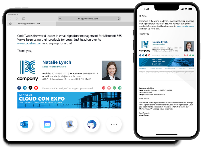 Automatize a aplicação de diferentes assinaturas em mensagens internas e externas, para remetentes específicos, destinatários ou grupos de idiomas selecionados. Faça uso de propriedades e atributos de usuário do Microsoft 365 (como departamento ou cargo) ou até palavras-chave no corpo ou assunto do e-mail para acionar assinaturas personalizadas. CodeTwo Email Signatures 365 se destaca como o gerenciador de assinaturas mais robusto e escalável disponível.