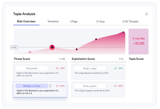 Concentre-se em vulnerabilidades que têm uma probabilidade real de serem exploradas em vez de resolver problemas que não existem.O TOPIA prioriza vulnerabilidades de software usando métricas de base CVSS e um mecanismo de pontuação de risco de uso contextual baseado em IA. Obtenha uma cobertura abrangente do status de segurança do seu ambiente digital com uma análise de ameaças contextual e personalizada